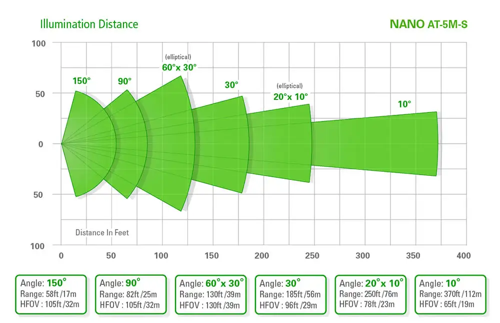 See the chart below to select the light beam angle option that matches your security camera’s F.O.V. or range needed for your application.